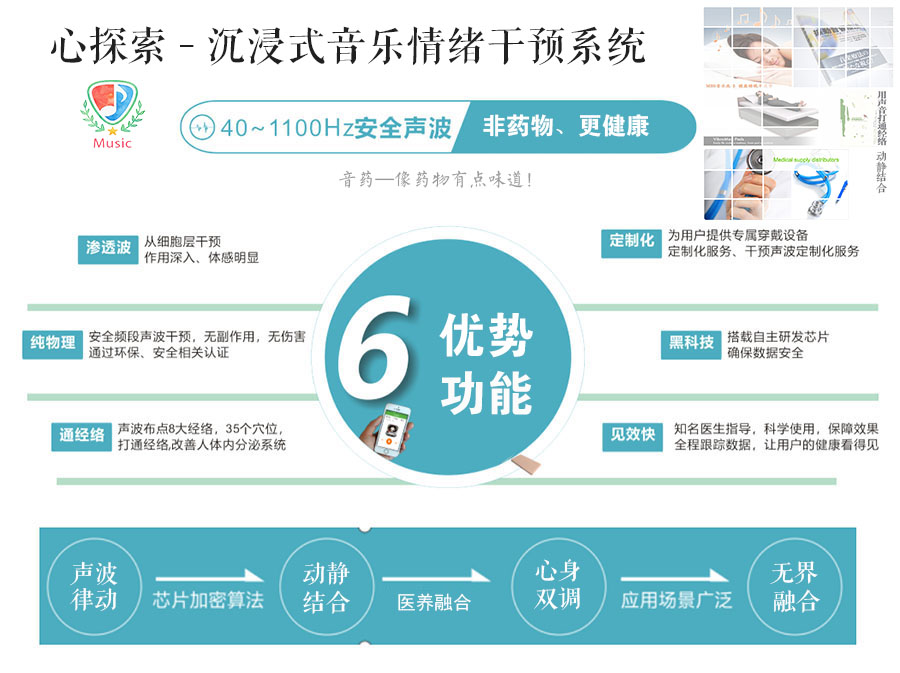 数字音乐疗法(Music Therapy)诞生于1940年的美国,并逐步发展成为一门集音乐学、心理学和医学为一体的综合性交叉学科,是音乐在艺术欣赏和审美领域之外的重要应用。用音乐调治身心是我国传统的怡情养性之法,西方国家也将其作为一种临床治疗方法广泛应用于精神病治疗、老年陪护、特殊教育、胎教早教、美容驻颜、睡眠减压等领域。